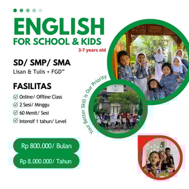 Kami membuka Program Les Bahasa Inggris di Kepanjen untuk berbagai usia dengan metode fun, komunikatif, dan terarah, cocok untuk anak-anak hingga dewasa.