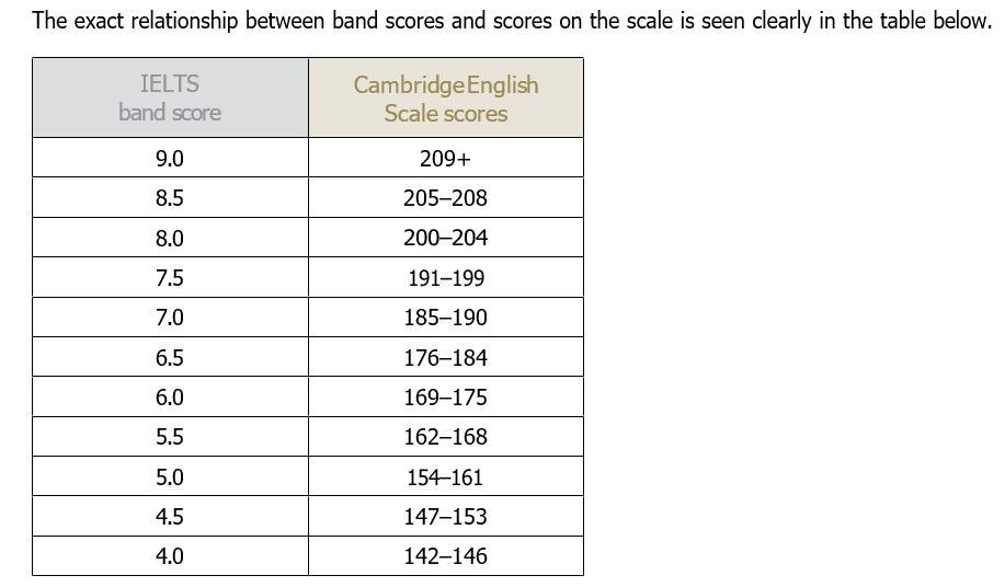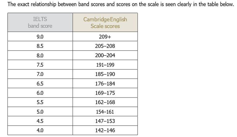The diagram below shows how IELTS band scores map to the Cambridge English Scale.