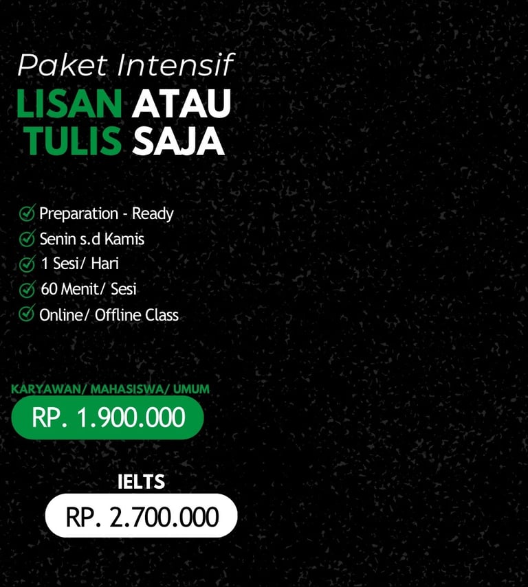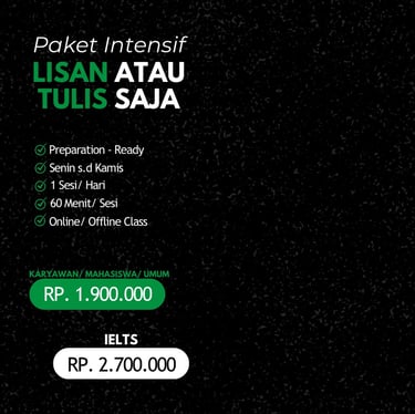 --Attention!!! Join kelas paket intensif lisan & tulis akan mempermudah pencapaian skill lebih seimbang dan signifikan dalam mencapai targetโ.